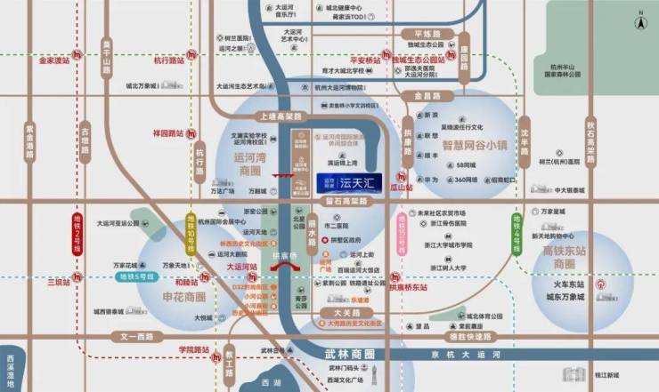 战略区位 踞守运河湾CBD南大门,无缝链接桥西、申花高端住区,执掌城北发展动脉。双高架(留石/上塘)+水上巴士+地铁5/15号线(规划)立体路网,30分钟速达杭州东站、萧山机场。