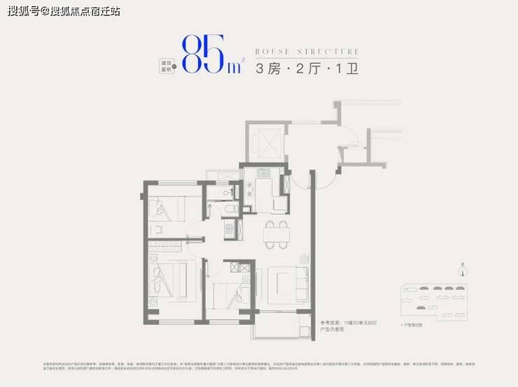 建面约85㎡3房1卫,做到三开间朝南+全卧室带飘窗+卫生间干湿分离+动静分离,非常紧凑的小3房。