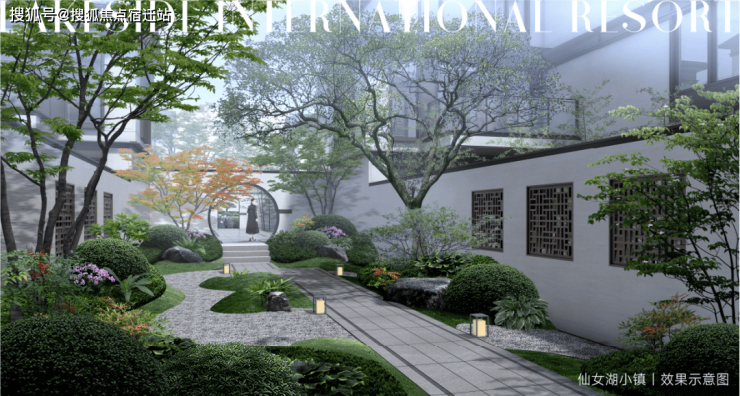 当你独坐露台或室内,玻璃幕墙、栏杆,丝毫不会影响你的景观视野;独门独户的院子里,有煮茶空间、 花道空间等,饮茶、插花、下棋或会客,可满足文人雅士般的归隐生活;当你徜徉在巷道里,两道深墙之间, 一条树木掩映下的林荫夹道上,偶遇一块精致的石头、一棵精致的树,转头又能看见一扇樱花点缀的花窗画景......