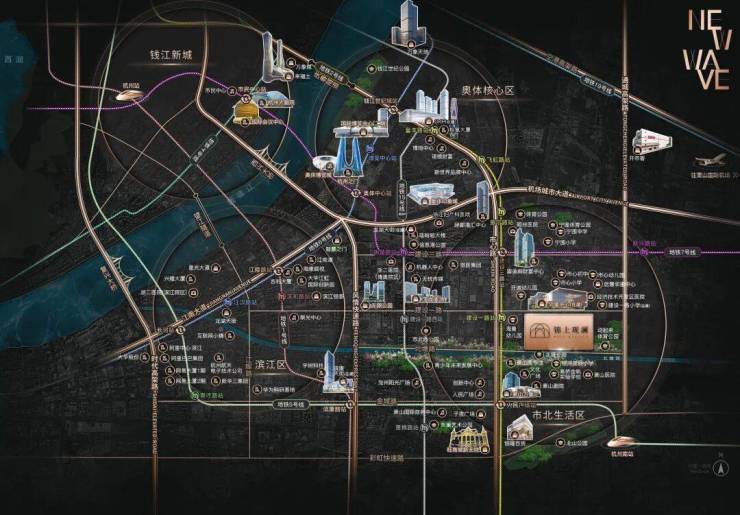 20分钟即可覆盖江南岸都市生活圈。同时项目西侧临近杭州中轴线市心路,串联奥体、钱江新城核芯商圈,是拥有坐标意义的杭州芯人居地标所在。