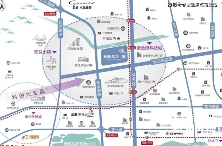 距离浙大紫金港小区约500米,区域内有浙江广播电视大学,还将有西湖大学、云谷学校等;
