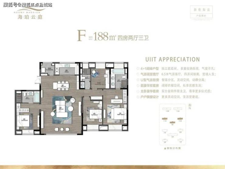 作为项目最大户型,建面约188㎡户型空间尺寸最阔绰,同样是四开间朝南+户户飘窗设计,南向6.5m宽厅连通交互式餐厨空间,空间更加宽敞明亮;主卧套房设计,宽敞的步入式衣帽间直击女主人的内心,同步设有双人台盆,私密性更强。