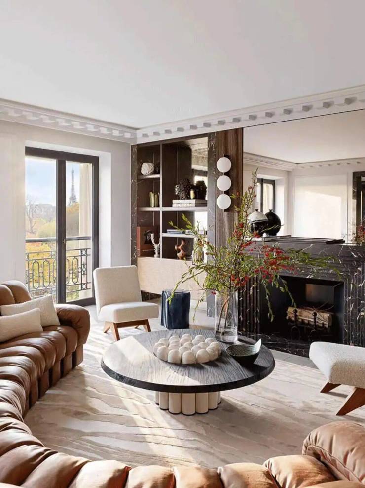餐客厅尺度达到了惊人的16米,97m²,用一席壁炉做了视线分离,米色的洞石、自然冰裂纹的艺术漆。背景墙拱形胡桃木的静谧,地板拼花木格纹的精细,沙发钢琴键织布的韵律,营造的是回归生活本质的轻松写意。