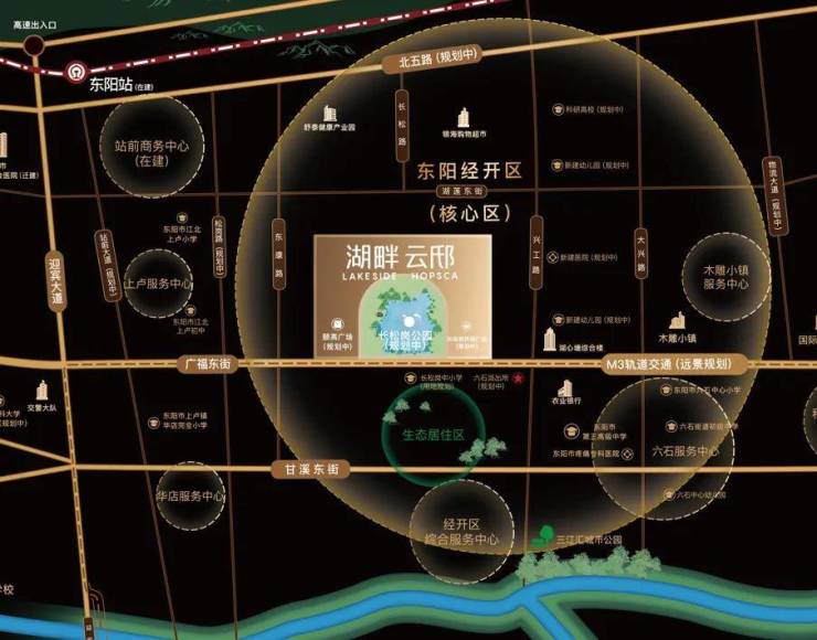 广福东路一脉链接江北新城,甬金高速六石出入口已经在建,甬金高速拓宽工程部分竣备,北五路已经在建,东阳北站已经建成使用。