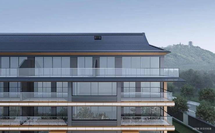 颂香望庐的建筑外立面沿袭传统宋式美学,采用四面铝板+三玻两腔玻璃立面,搭配爱马仕灰和蓝眼睛石材,古典但不失现代质感。