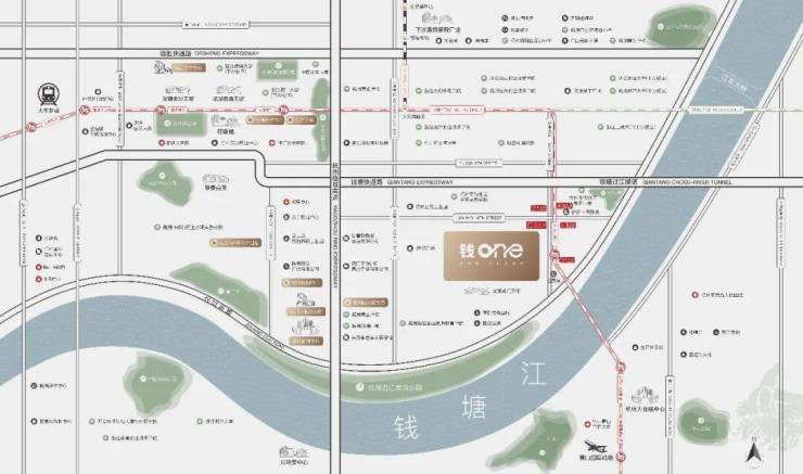 【交通路网】钱塘快速路(钱塘过江隧道)、德胜快速路、东湖高架(串联萧山与临平)、杭州绕城高速等快速路网,周边沿江大道、25号大街、14号大街、23号大街等连通八方财富。