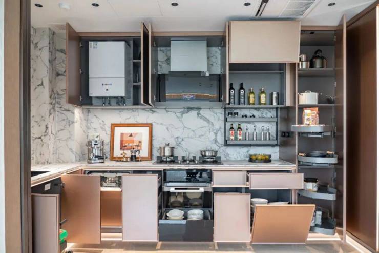 首先是在品牌配置上,做了精心考量。三大件选用的大金S级中央空调、兰舍新风系统和菲斯曼地暖;厨房配置了包含微烤一体机、单冷藏/单冷冻冰箱、洗碗机在内的美诺四件套,以及更适合中国厨房烹饪习惯的方太厨电,并采用了高端系列的隐藏款抽油烟机;卫浴品牌使用的德国唯宝,主卧的淋浴设备更是使用了意大利进口高端品牌Gessi。