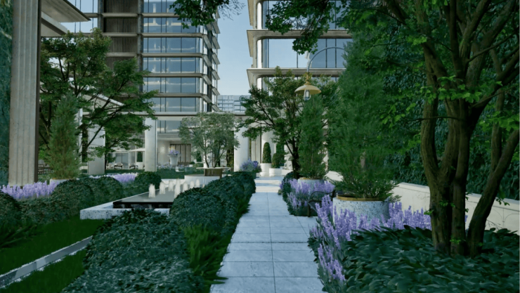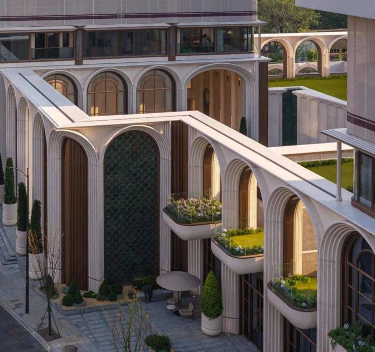 与此同时,全立体抬升的创新举措,也营造了空中私密花园的意境。庄园营造哲学与东方园林神韵融合而成的景观,被置于约6米高的抬地之上,仿若悬浮于空中,天然地从物理层面就隔绝了外界的喧嚣及变电站等相关不利因素的影响,形成更静谧,也更私密的圈层生活场域。