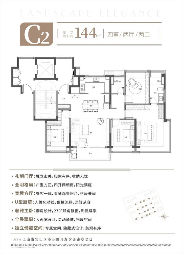 大尺度聚合方厅,为全家人打造陪伴高能的欢聚场;U型厨房,与一体化客餐厅、宽景阳台贯通,令家居动线更开阔流畅;奢雅主卧套房,270°转角飘窗视野,主人品位与格调尽情绽放;隐藏式独立储藏空间,可更轻松、有序收大件物品。