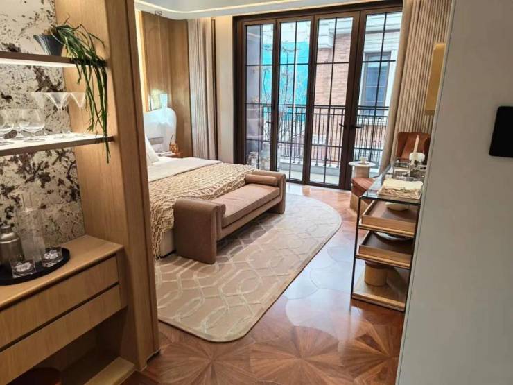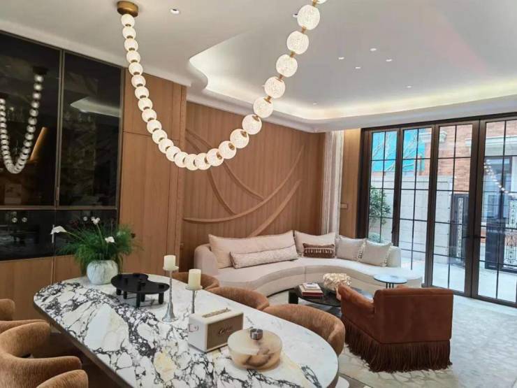 建筑立面融合红砖、石材与金属线条,复刻五大经典海派立面。每块红砖经900℃窑火淬炼,以"梅花丁"工法铺陈;门头、窗套采用福建青石手工雕刻ArtDeco几何纹样。室内层高3.6米(一层)与3.3米(二层),配置德国毛细管网恒温恒氧系统,精选美诺、汉斯格雅等国际一线精装品牌,平衡历史风貌与现代舒适。