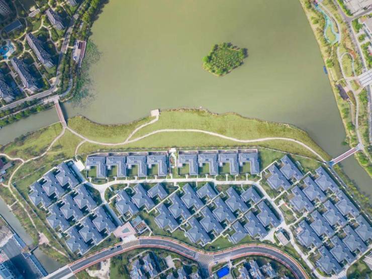 78套院落,就坐落在总建约200万方太湖健康城之芯,与其东面的高层组团清晰分割,独立成一个区域,沿着一线的翡翠湖湖景位置低伏生长,承载着我们最初的湖居梦想;