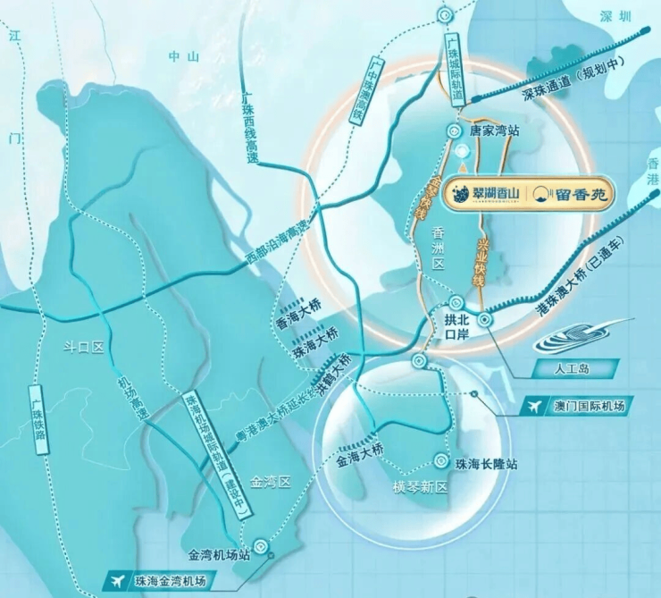 交通配套:可乘坐10a路, 69路, 70路, 72a路, k3路, 珠海北站专线到达项目。港珠澳大桥,直达港澳。深中通道,约40分钟到达深圳,海上交通30分钟抵达澳门、深圳,1小时到达香港