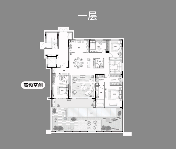 约700m²确实庞大,产品臻稀,考虑不当,就会陷入功能的混乱和无用中,辜负了这样优越的大平层“高配”户型。因此,我们首先分隔大块空间:一楼满足日常生活居住,跃层实现丰富的人生理想。