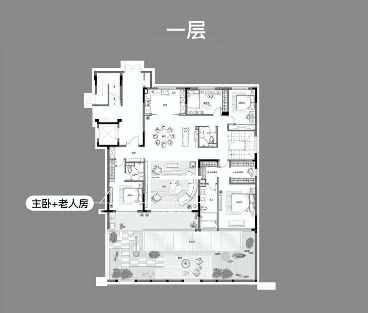 在空间打造上,我们关注“高低频”。客厅和双套房这些高频使用区,连通南向大花园,采光视野绝佳,充分放大体验感。阔达约60m²的客餐横厅,举步有天有地的院落场景,让全家尽享天伦之乐。像围绕客厅公卫的一圈走道,属低频区,我们便打造成“光之回廊”,方便孩子肆意跑动,升华空间功能。