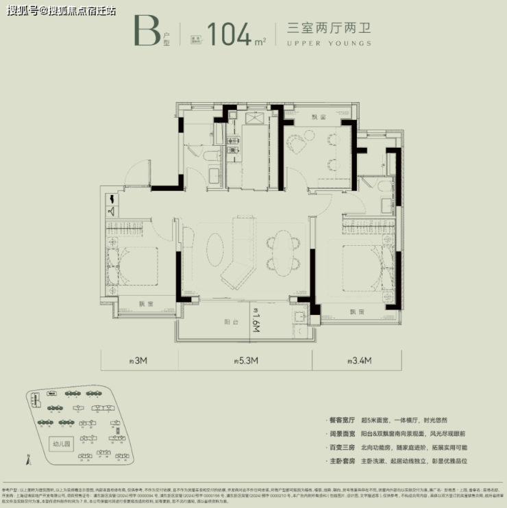 最后,一起来看新杨思上园的此次四期推出的收官产品线:建面约104㎡3房2厅2卫户型,该户型规划有A\B两款设计,为改善人群提供更多样的选择!