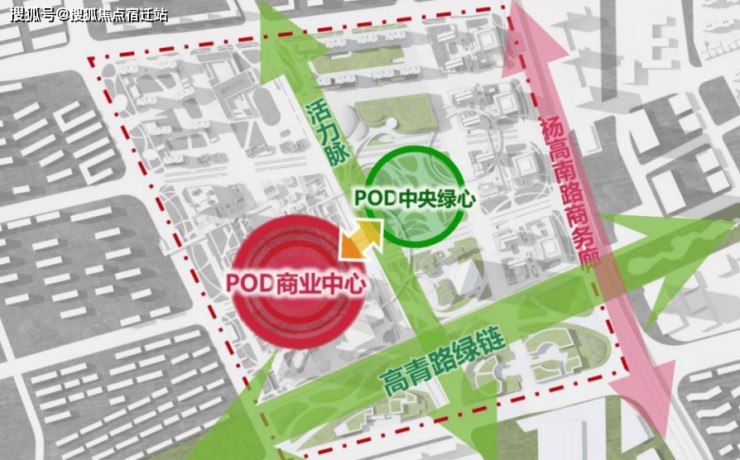 其中,日本设计为新杨思区域提出了一个超前规划理念:Double POD (Park Oriented Development + Pedestrian Oriented Development),即以生态公园为导向+以城市漫步为导向的城市开发模式!其设计重点为中央绿心与商业中心双核联动!