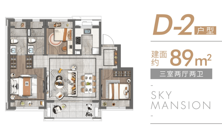 9-10层洋房:建面约89㎡(三房两厅两卫)