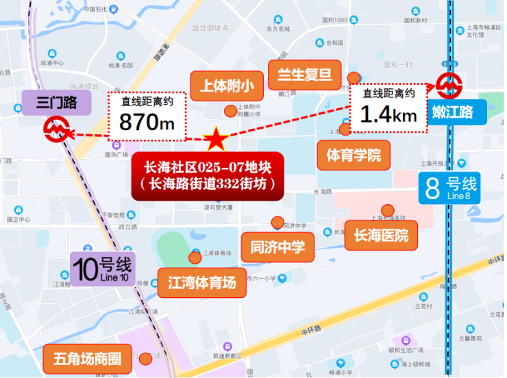 2022年7月,上海第二批次土拍中,杨浦置业以20.8816亿元,竞得杨浦区长海社区025-07地块(长海路街道332街坊)地块,地块出让面积16638.7㎡,容积率2.5,溢价率0%,成交楼板价50200元/㎡,房地联动价99000元/㎡。
