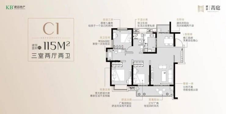 ③ 建面约115㎡,三室两厅两卫。户型面积更加宽敞,房间品质也再升一级。双阳台、大三室、三面采光,尺度尽显;双卫生间也让生活更加方便。