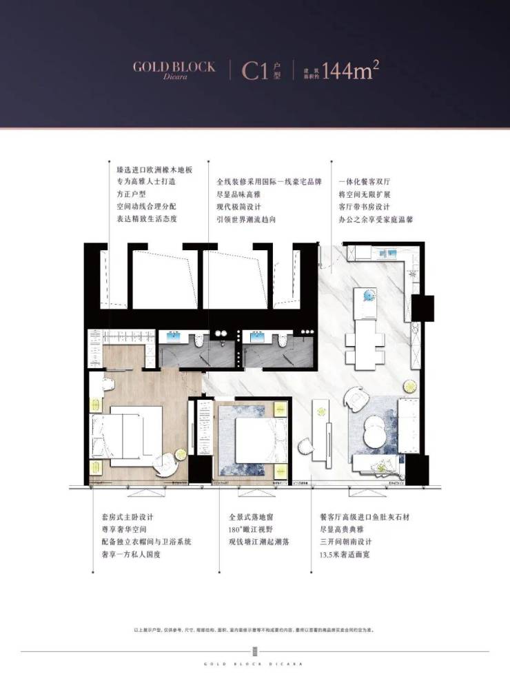 建筑面积约60-150㎡江景总裁公馆,与日月同辉为邻; 世界潮流趋势,搭配全球高端精装品牌:欧洲劳芬卫浴、德国当代洁具、东芝中央空调、意大利瑞帝安地暖;甄选优质进口石材、木饰面、地板等;