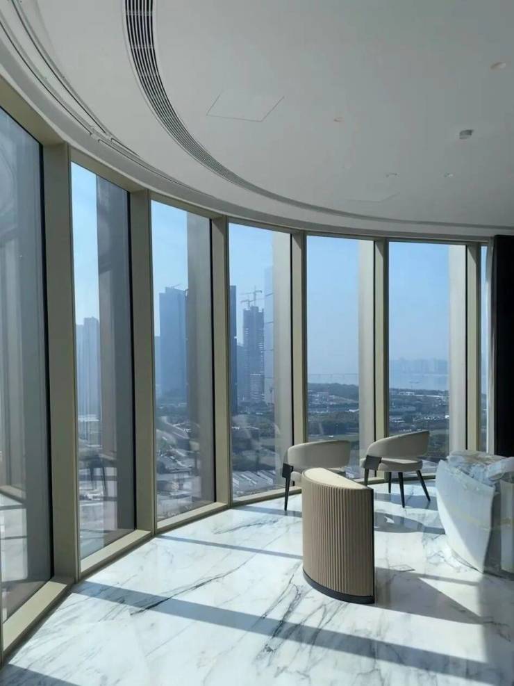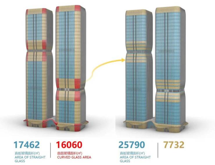通过优化,直板玻璃面积大幅增加,从17462平米提升到25790平米,单曲玻璃为7732平米,仅极少部分使用双曲玻璃。在满足建筑立面效果前提下,不仅解决室内炫光问题,还降低玻璃自爆率。