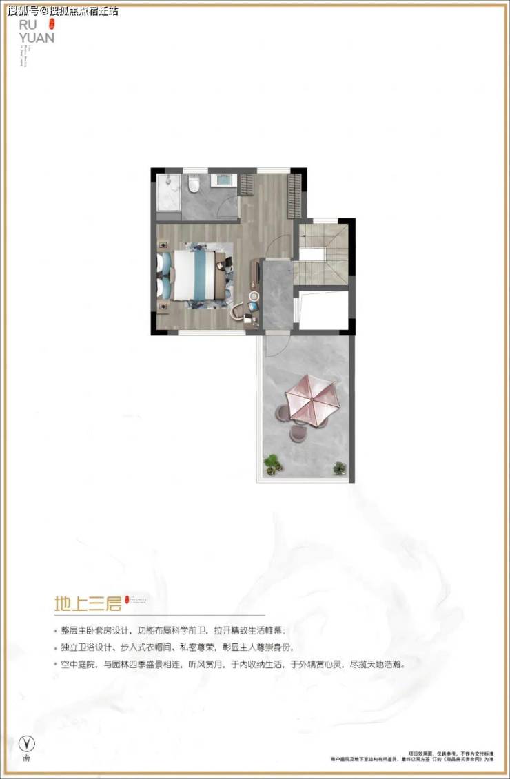 三楼整层主卧套房设计,带空中庭院。当夏天的时候约几个朋友在庭院上喝喝茶,或者约几个朋友吃吃烧烤,喝喝啤酒,让您真正感受到人生的惬意和人与自然共呼吸的美好生活。