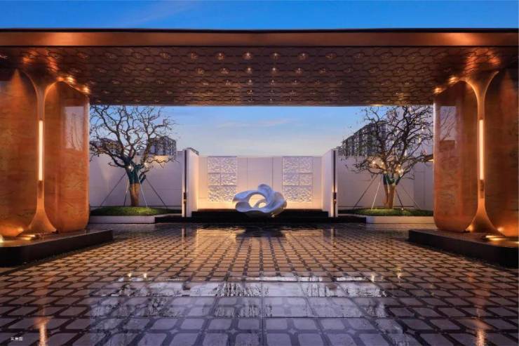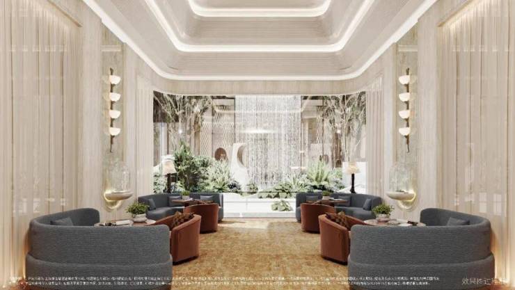 静谧首层前厅:规划约70米疏朗尺度门庭,花柱设计巧妙衔接前场园林,营造步入式尊贵感