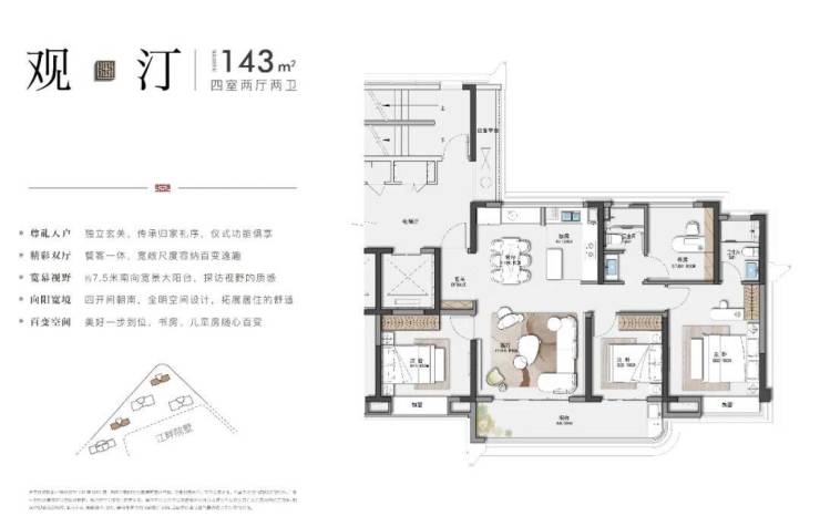 以建面约143㎡【观汀】的户型为例,方正户型上减少了大面积浪费,主卧、两个次卧、客厅四开间朝南,餐客一体直连约7.5m大阳台,主卧与一个次卧向南赠送飘窗,另一个次卧连接阳台,尽情享受阳光生活。