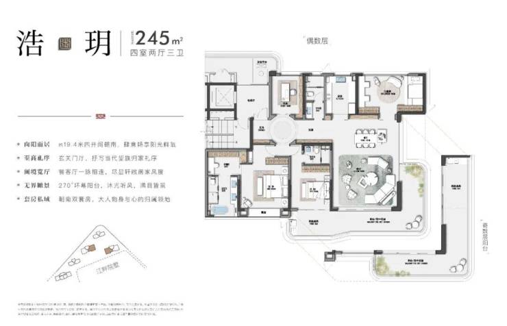 而建面约245㎡的【浩玥】户型,也是同样四室两厅三卫的配置,可以说是198㎡户型的“PLUS”版,进一步上升了生活尺度——约19.4m四开间朝南的设计,自然阳光入室,为空中花园的景观打造提供更大的想象空间。