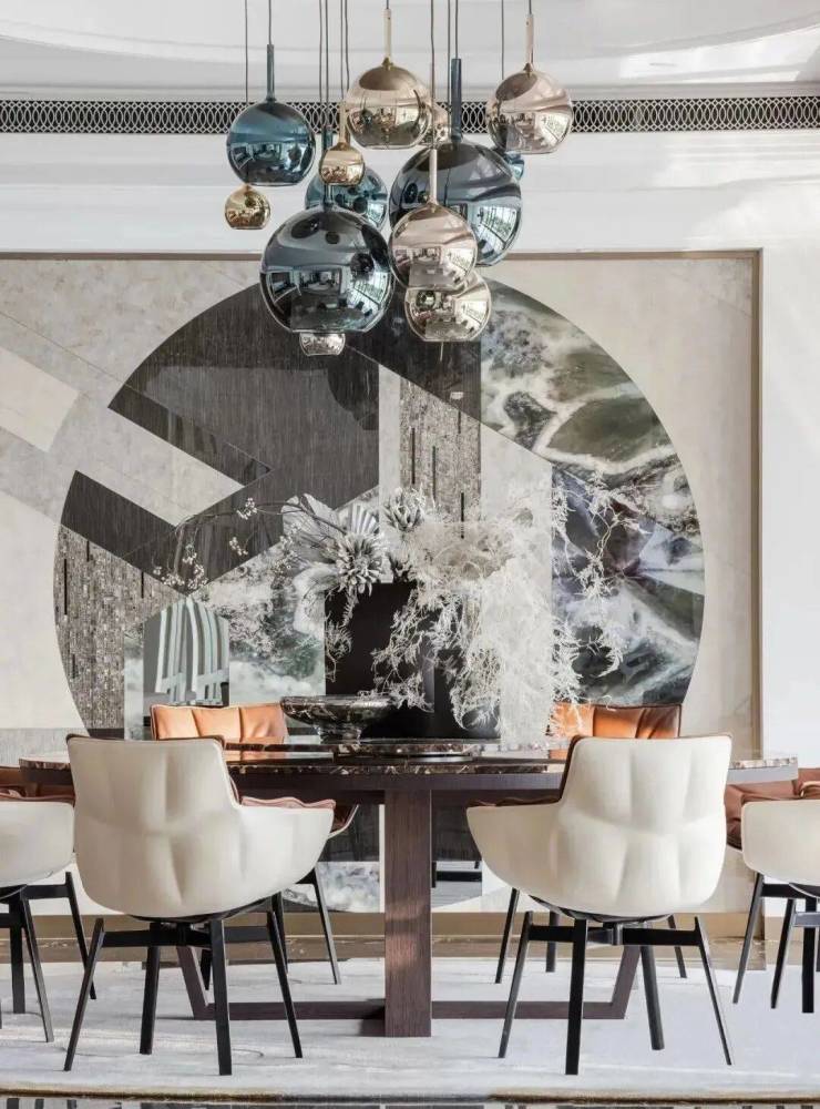 餐厅背景墙由马赛克结合有机矿石玻璃制成,用几何拼接的方式做圆,艺术感之余,亦将中轴线移动,使得用餐与备餐的过道更加宽敞。