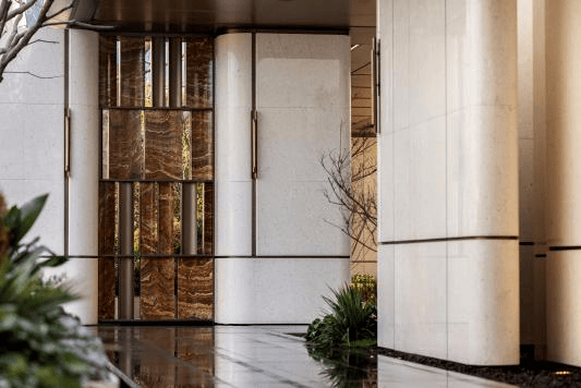 顶级审美是十分稀缺的资源。在高度同质化行业时代内,海上·清和玺对产品设计提出了新的挑战,基于上海徐汇滨江在地审美的高度致敬,海上·清和玺立面创新,定制曲面流体建筑,温润曲线的设计线条下,开创新的标准。立面顶部结合大理石和金色格栅做出了风格迥异的“金镶玉”设计美学,并且增加了大量的石材基座弧面纹理、玺系山茶花图腾纹路设计,让建筑之美触达各处。