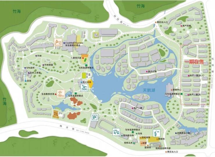 港中旅安吉度假区占地1356亩,由Clubmed Joyview度假村、度假村配套、商业小镇、休闲度假产品几个业态组成。其中度假村及度假村配套占地700亩,休闲度假产品占660亩。