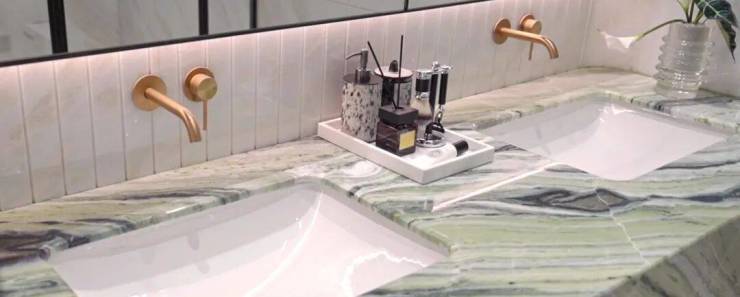 劳芬捷仕的卫浴,凝聚了意大利的优雅浪漫与设计创新。拉丝青铜的龙头配着云中翡翠的台面,映着窗外绿意盎然,充满了生活艺术调性。