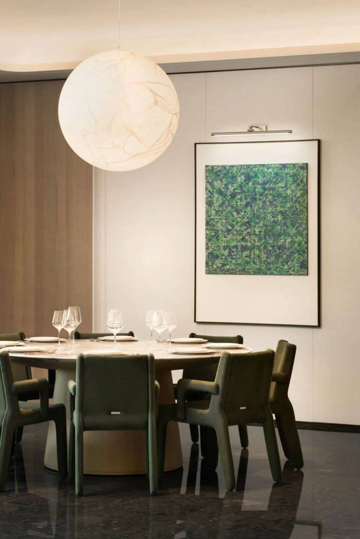 8人圆桌上悬着一盏和纸月灯,柔和的光影将月亮带回家里,这时你就拥有了四个月亮,天上一个,江上一个,心里,还有一个。
