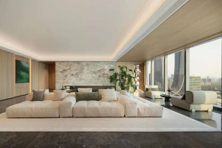 约4.3m的层高,意大利Saba白鹅绒像素沙发,高度压低,谦逊的让位于窗景,让这幅环幕剧场成为空间真正的主角。烟雨江南的背景墙,丝丝缕缕如水墨晕开,客厅里的春羽用绿意点缀着丛林的生机。