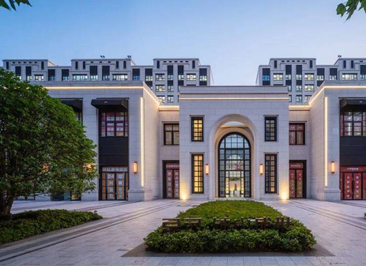 在南侧主入口的尽头,一座巍峨的迎宾景墙矗立,其背景色采用了与建筑风格完美融合的厚铜色,彰显出庄重而典雅的格调。景墙前,一处精致的中国黑石材水景巧妙布局,简约而不失雅致,为社区营造出一片宁静而优雅的氛围。水景的流动之美,如同生命的脉搏,为这片空间注入了活力与生机。