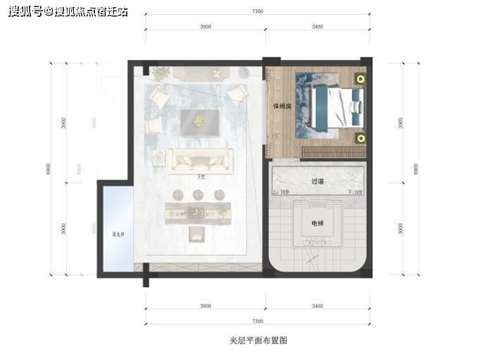 ● 约5.6米层高,可设夹层,布置静幽茶室、地下会客厅、保姆房