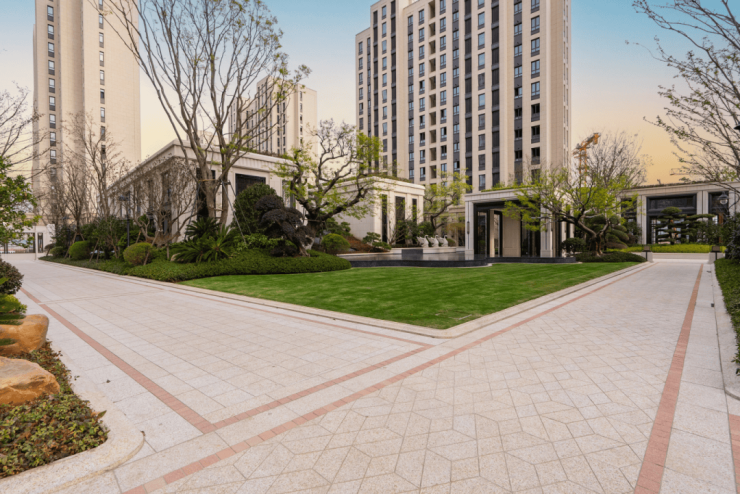第二,水景池采用挪威蓝珍珠打磨,花坛立面-压顶使用保加利亚沉香米黄,搭配堆坡景观,层次错落。