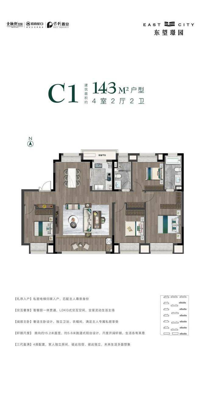 无界的宽奢居所为了柔化家人之间的无形边界,东望璟园,建面约110-168㎡无界宽奢居所,LDKG超大交互空间,南向超大面宽,甲板式阳台,不断延伸居住边界,为高端改善家庭铺陈无限生活可能。
