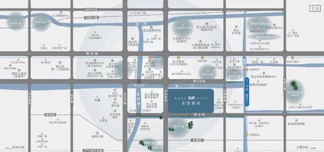 [双极城市门户]:向西约2公里即达青阳港城市中心,向东约3-5公里接驳夏驾河科创走廊与体育公园[双城动脉融汇]:轨道交通S1号线、前进路、中环东路、震川东路、景王路、长江中路、沪宁高速[ 政经双极之核]:昆山市政府、东区行政中心、开发区政府、昆山市政务服务中心、昆山市应急管理局[双面繁华主场]:左拥金鹰购物中心、九方购物中心、大润发、万达广场 右揽世茂广场、首创奥特莱斯[ 双面菁英优教]:上海华二昆山国际学校、景王路一贯制学校(在建)、昆山国际学校、青阳港实验学校、震川中学[双享宜居胜地]:黄浦公园、景王公园、时代公园、体育公园、夏驾河湿地公园、黄兴公园[双重医疗保障]:昆山第一人民医院友谊院区、东部医疗中心(在建中)、宗仁卿纪念医院