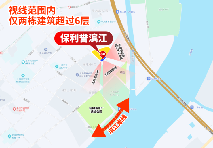 恰到好处的建筑高度,搭配正面无遮挡的瞰江角度,将江景视野做到更大化与更优化:向南望去,黄浦江的壮阔江面与杨树浦电厂公园、油酷艺术公园等滨江绿带无缝衔接,未来杨树浦电厂更有望成为整个上海滨江的“梦中心”。