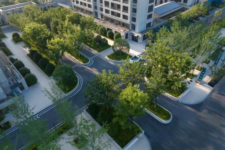 遵循大都会风格的国际化礼遇,我们将轴线的气场设计于入口,为了美化流线的划分,以长达约70米的榉树大道实现人车分流,形成充满仪式感的流线礼遇之外,更重视归家的安全性。