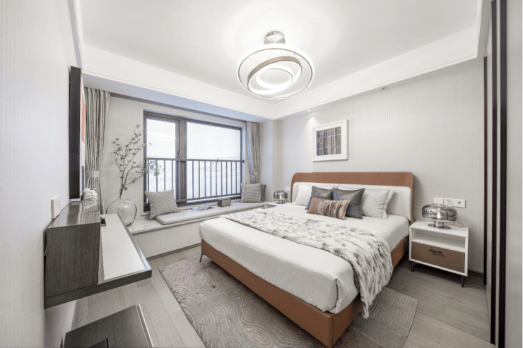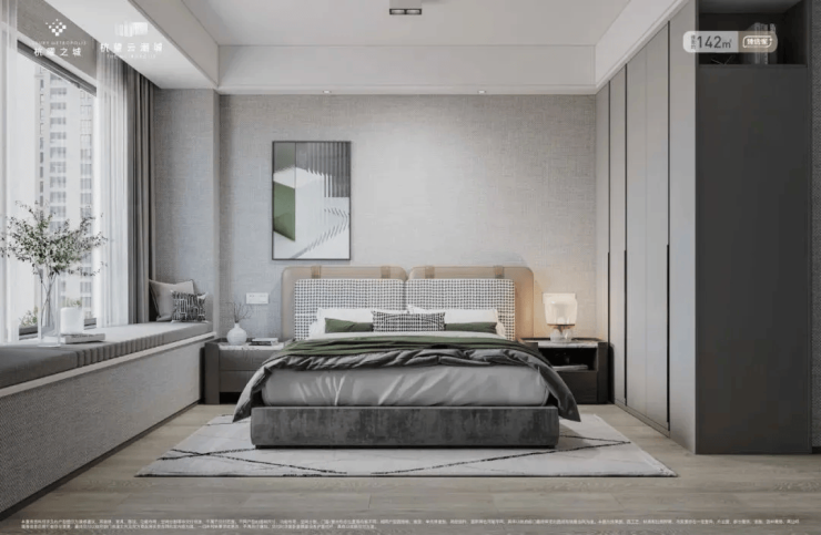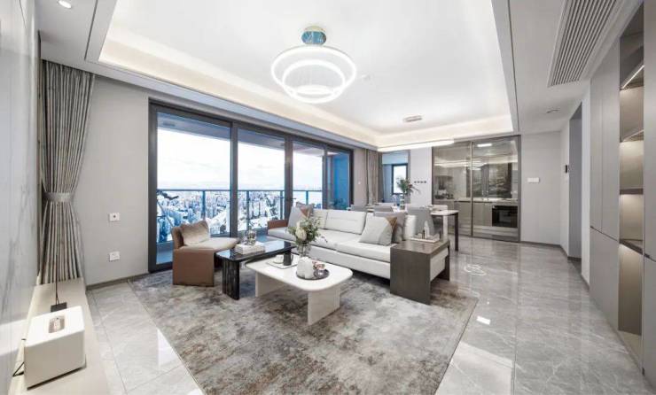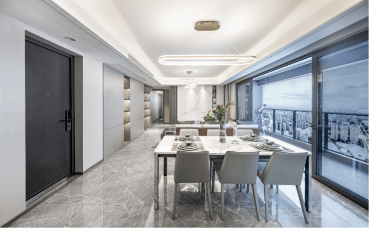 立面风格依然是融创经典的现代高级灰,杭曜之城&杭望云潮城还进一步优化了建筑立面,大面玻璃点缀香槟金线条,建筑体精致又鲜明,交付后无疑又是区域的吸睛焦点。