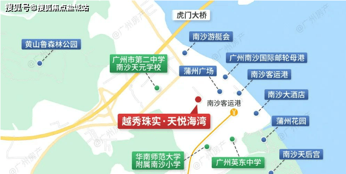 越秀珠实·天悦海湾,位于南沙湾·港前大道,属于南沙湾板块。从港前大道,一路途经南沙大酒店、邮轮母港、游艇会、高尔夫球会......一看就是“高阶玩家”配套。周边还有蒲州花园、南沙天后宫、黄鲁山森林公园,风光无限,自住或养老,都是不错的选择。