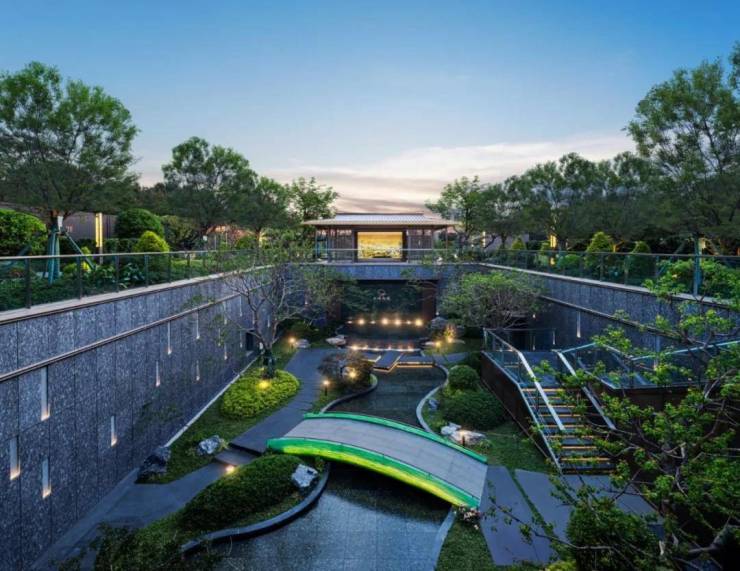 写意瘦西湖,亭廊林立,层林纳园,超大核心水系约900㎡,冰川蓝马赛克池底,长廊围合,中心发光庭透光玉石点缀,涌泉跌水,营造浪漫度假氛围