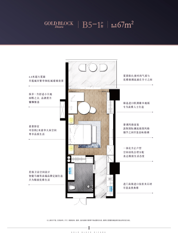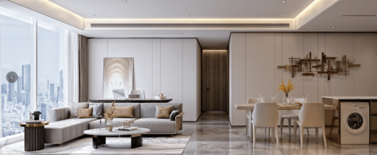 建筑面积约60-150㎡江景总裁公馆,与日月同辉为邻; 世界潮流趋势,搭配全球高端精装品牌:欧洲劳芬卫浴、德国当代洁具、东芝中央空调、意大利瑞帝安地暖;甄选优质进口石材、木饰面、地板等;