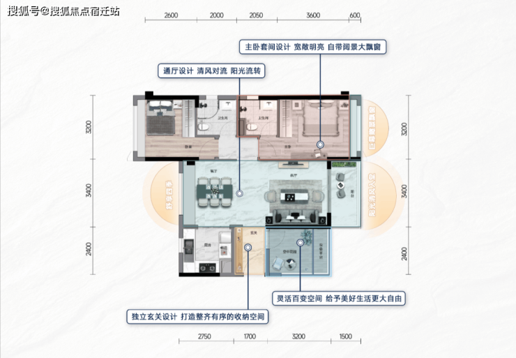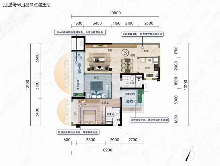 入户独立玄关,增加了收纳系统,客餐厅“南阳台+北飘窗”设计,实现了南北对流,这在市面同面积段产品中,相当少见。