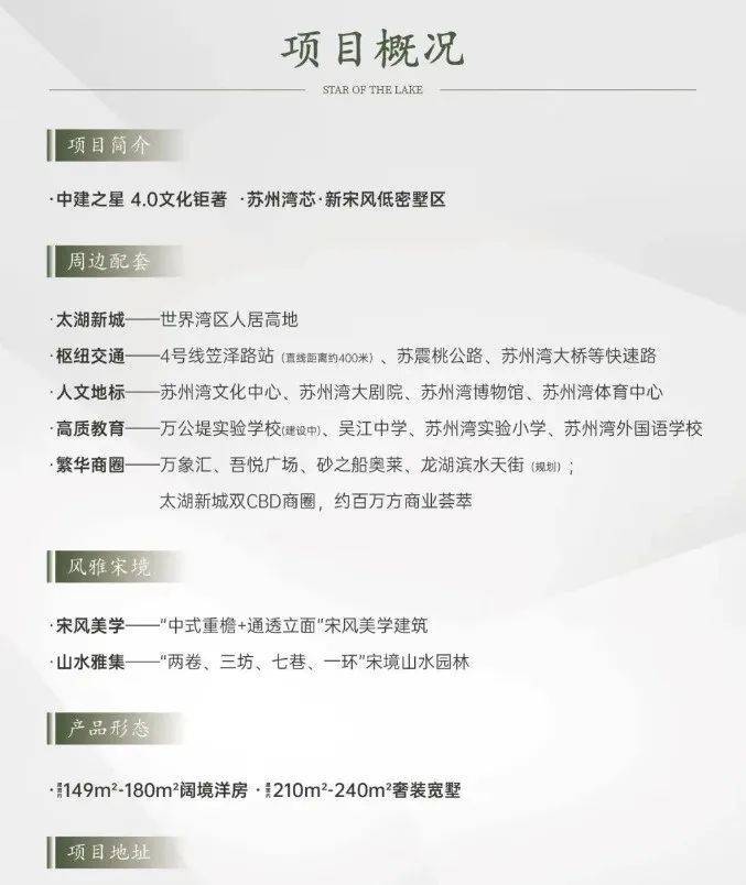 阅湖之星以产品划界圈层,约1.3容积率,规划6-7F低密墅区真洋房及4F奢装天地墅,敬邀高净值纯粹塔尖藏家入席。甄选世界大师级精装品牌入户,打造建面约149-180㎡阔境洋房,建面约215-240㎡奢装宽墅,以趋同世界的极享,为苏州CEO量身定制。