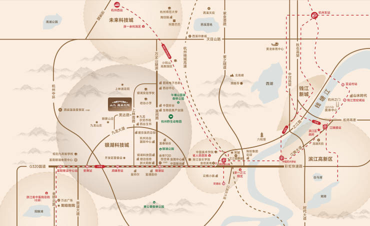 项目位于银湖科技城融杭门户,抢占交通资源高地,约1500米连接杭州地铁6号线虎啸杏站,瞬达杭州主城核芯。毗邻G320国道与彩虹快速路西延段,形成快速融杭交通走廊。