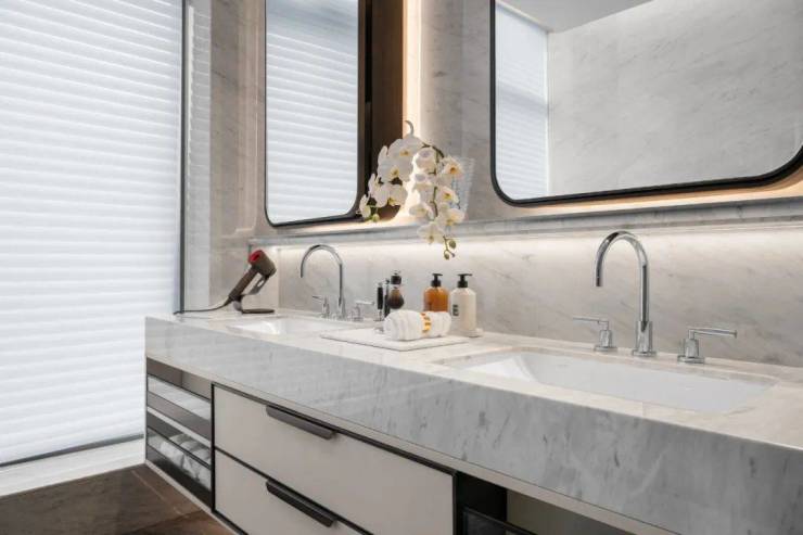 厨房选用德国百年品牌 Miele厨电9件套;从健康出发,卫生间配备了松下水离子净味器,消除异味,抑制过敏原增长,还有当代洁具,劳芬马桶,卡德维浴缸等全球好物,提升生活体验。